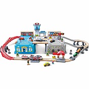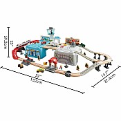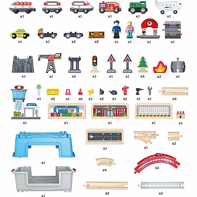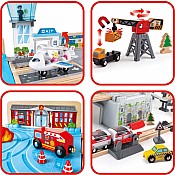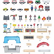 The Super Cityscape Transport Bucket Set comes with everyway to get around town! The set includes a freight train with two carriages,an inter-city battery powered train with two passenger cars,a fire truck,a crane,a taxi and even a plane! Also included is everything needed to build your city from trees to a watch tower and two figures to travel throughout city. This 80-piece set stores easily in its container,which also becomes part of the city when set up.
