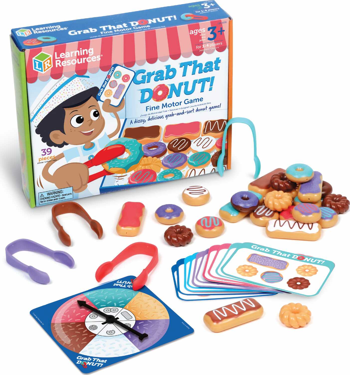 This sweet sorting set is a donut delight! Spin the spinner, grab your tongs, and sort the donuts by color, frosting or decoration type. Be the first to fill your order and win! Includes 24 colorful mini-donuts, 4 sets of tongs, order cards and donut spinner. Box doubles as activity set and storage.