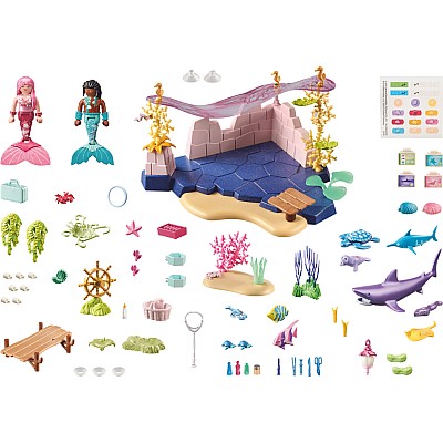 Care for sea life with the Playmobil mermaid setDive into an enchanting underwater world with the Playmobil Mermaid Animal Care set. This magical playset lets kids explore Princess Magic's underwater kingdom, where mermaids care for adorable sea creatures. From bandaging wounds to cleaning shark teeth, every sea animal gets the help it needs. With vibrant water plants and various sea animals, this set sparks imaginative play for children aged 4 and up.