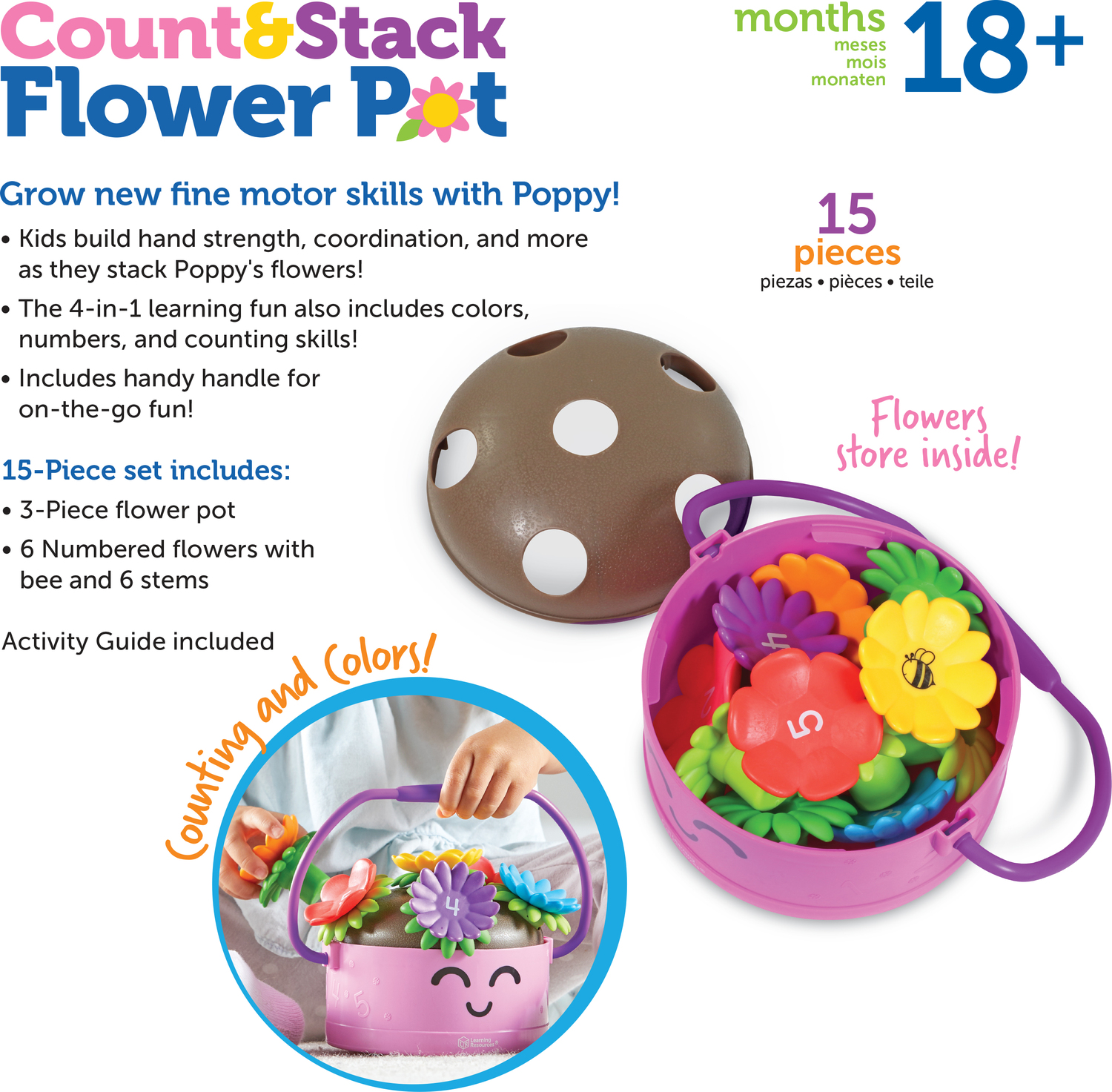 Grow all-new fine motor skills with the help of this friendly flower pot! As kids explore Poppy's 5 stackable two-piece flowers, they'll build the necessary hand-eye coordination to succeed in real-world situations! Each flower comes with different colors and numbers for added learning fun. All pieces store inside a pot for easy cleanup.