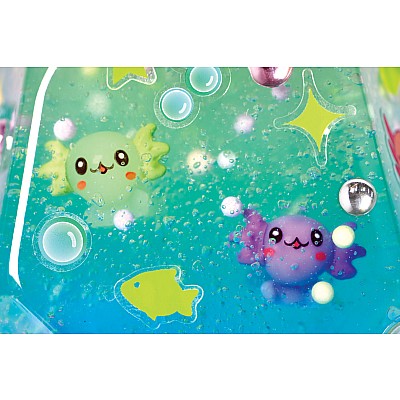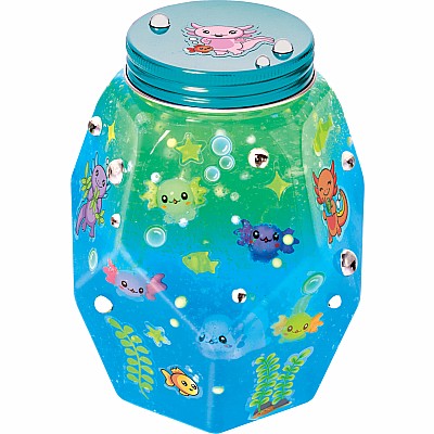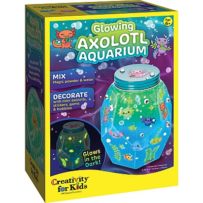 The Creativity for Kids Glowing Axolotl Aquarium includes a fun-shaped container, 5 axolotl figurines, glow bubbles, glow stickers and fun accessories.