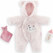 Bébé Calin Loving Teddy Bear is a 12-inch baby doll that is perfectly sized to be cradled in a young child's arms and is ideal for hugging and cuddling. The doll's face, arms and legs are made of touchably soft vinyl that is delicately scented with vanilla -- a Corolle signature. Bébé Calin Loving Teddy Bear's soft body is poseable, like a real baby. The doll's blue sleepy eyes close when it's put down for a nap or at bedtime, also like a real baby. Bébé Calin Loving Teddy Bear's furry "suit" is removable to reveal a printed body. The doll comes complete with a feeding bottle and lovey. Ages 18 months and up.