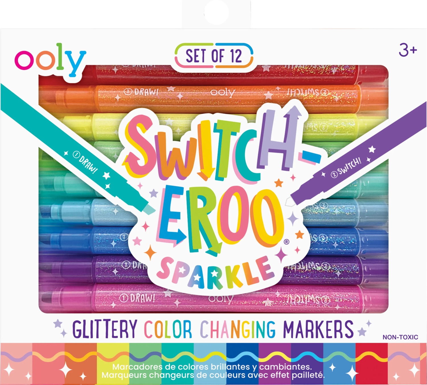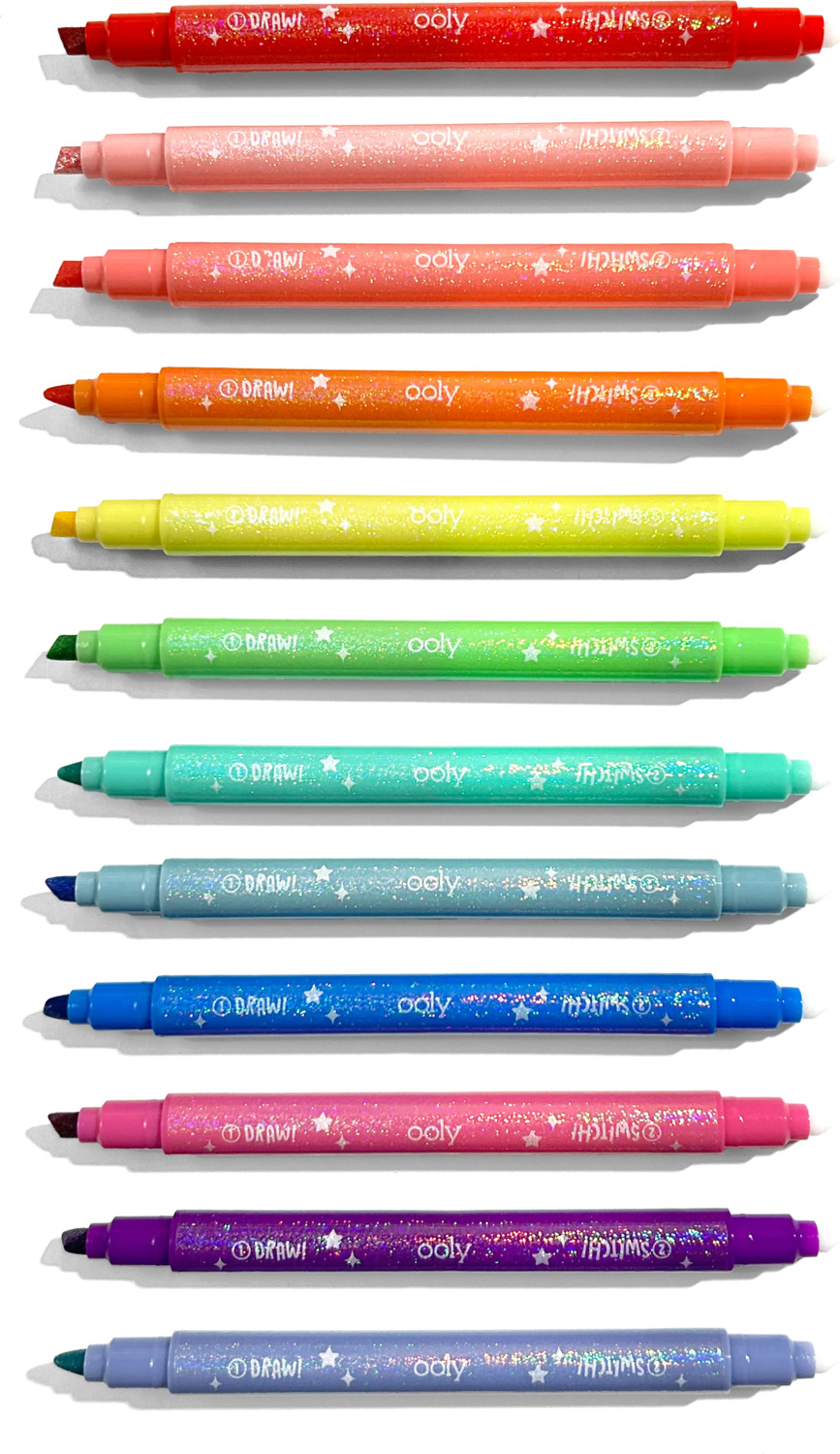 Add some sparkle to your creations with the Switch-Eroo Sparkle Glittery Color Changing Markers! This set of 12 color changing markers combines vibrant glittery hues with an exciting surprise—each marker is double-ended, featuring a dazzling glittery color on one side and a surprise mystery color on the other. Use the glitter side to add shimmer and shine, then flip the marker to reveal a secret shade to totally switch up the shade and switch up your design. These glitter markers are ready for all your creative endeavors - decorating cards, personalizing notebooks, or making school projects stand out.