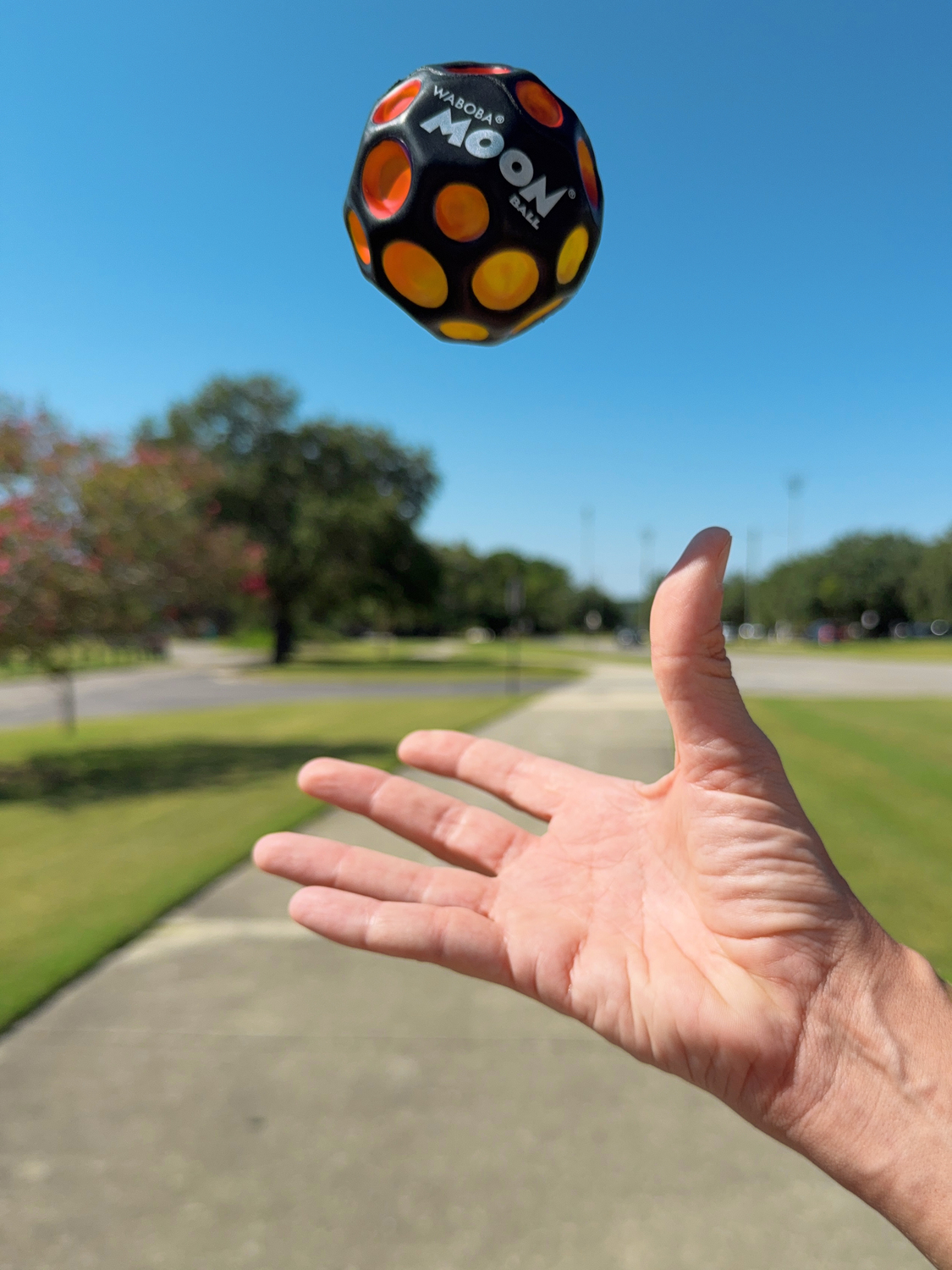When exposed to sunlight, the Moon Ball’s cratered surface changes color from yellow to red using UV-activated ink. Bring it back indoors and the color shifts back to yellow, ready for the next outdoor adventure. With its signature Moon Ball bounce, it’s perfect for energetic play both inside and out.