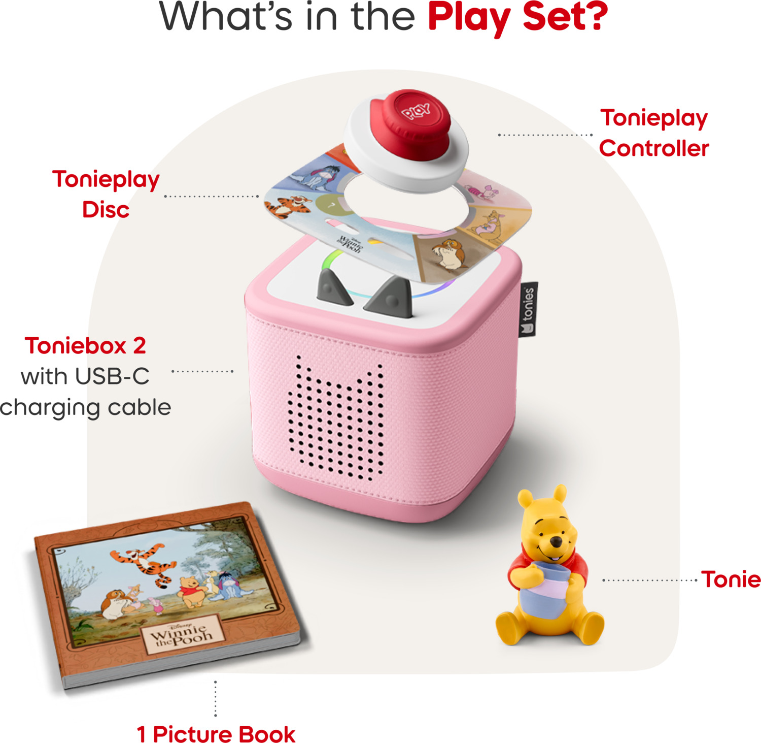 Everything they need to listen, grow and play in a whole new way with Toniebox 2. This Play Set comes with a Disney Winnie the Pooh Tonie figurine, the Disney Winnie the Pooh: Tigger's Mix-Up Fix-Up Tonieplay game and a Cloud Pink Toniebox 2.