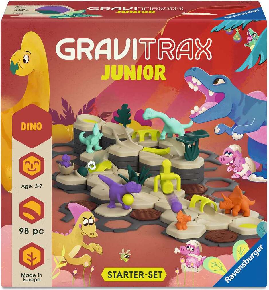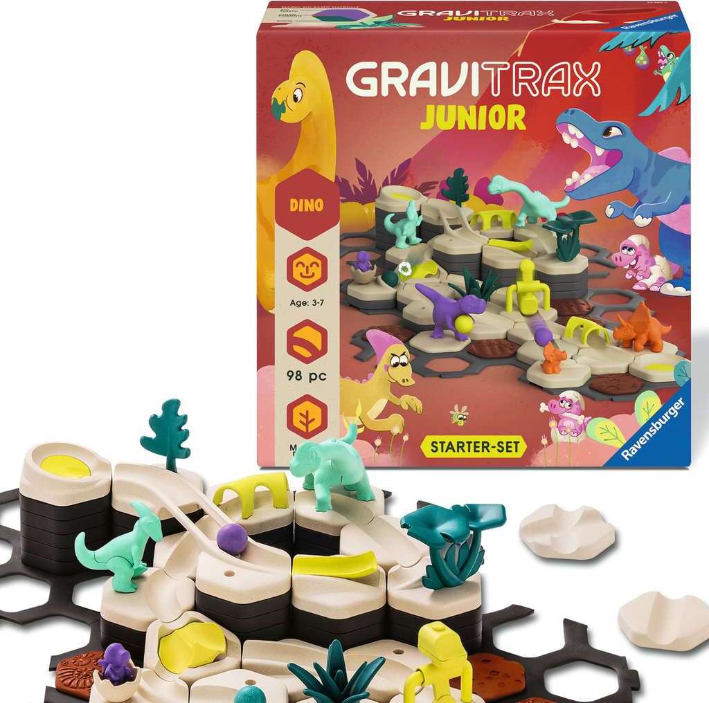 With the GraviTrax Junior Starter Set L Dino, boys and girls aged 3 and over can immerse themselves in the world of dinosaurs. The set contains everything to start building right away. With a variety of dinosaur figures and elements from the world of dinosaurs, children can experience the world of dinosaurs up close. Exciting components such as tunnel curves, a switch, a 3-in-1-curve and crossings make the building fun perfect. All components are made of wooden bioplastic.