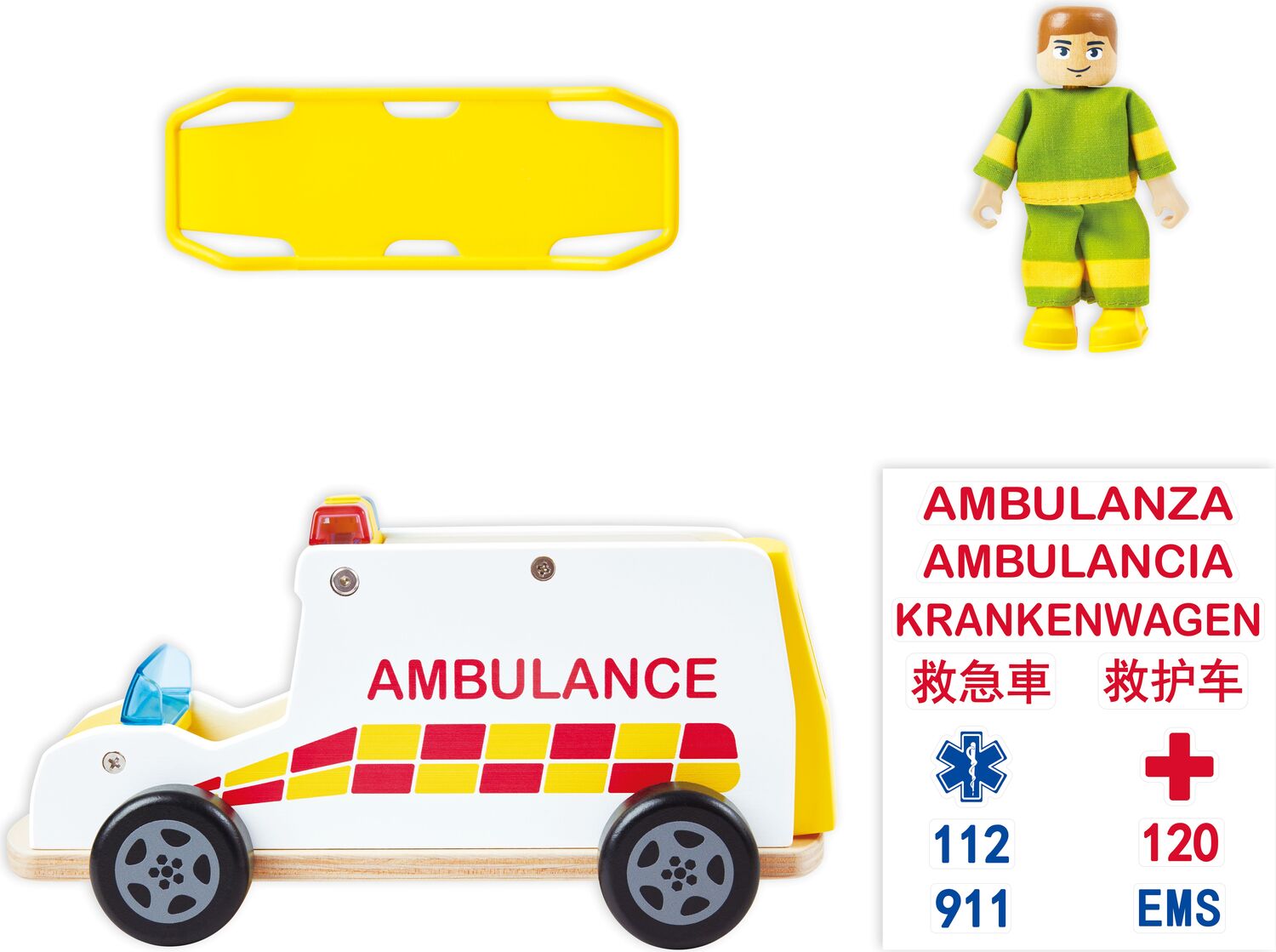 1 vehicle, 1 Medical Figure, 1 Stretcher, 1 Emergency Sticker