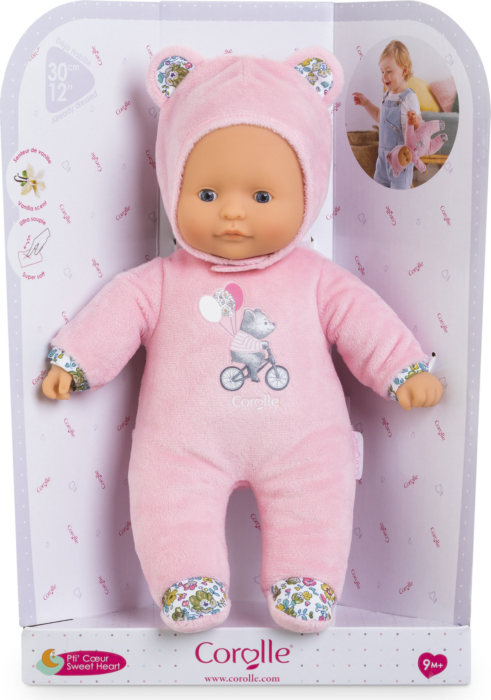 Sweet Heart Pink Bear is the perfect play companion for ages 9 months and up. At 12” tall and with a cushiony soft body, it’s the right size for little hands to grasp and hold. The doll's head and hands are made of soft vinyl that is delicately scented with vanilla, a Corolle signature. Its sewn-on outfit is not removable and therefore impossible to lose. With blue fixed eyes.