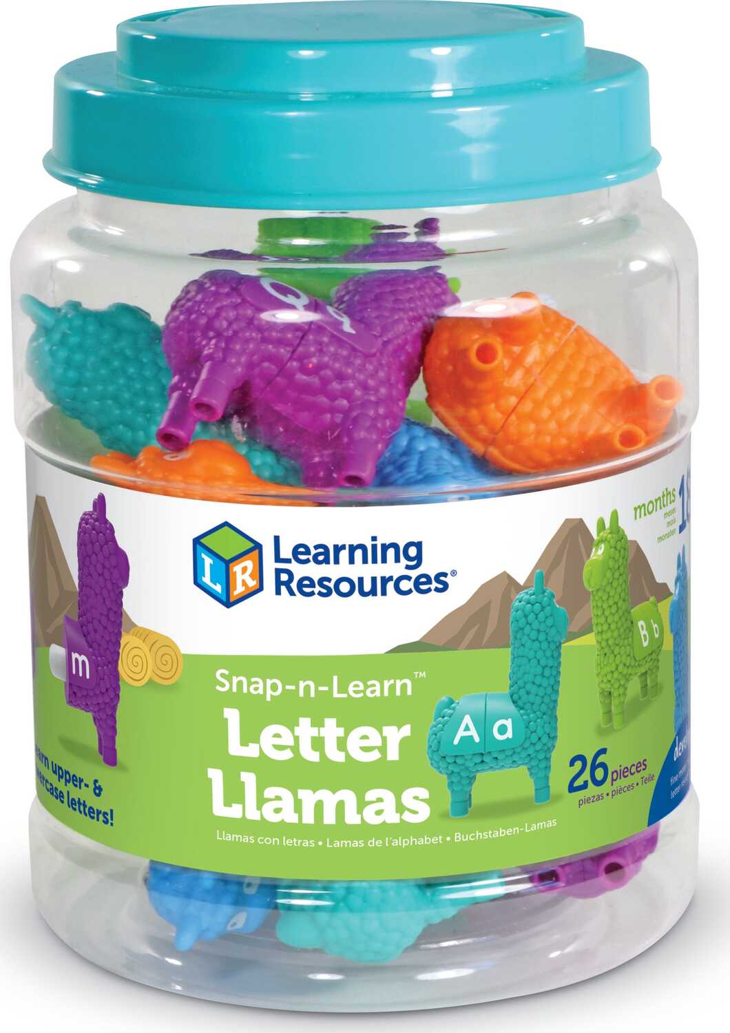These adorable llamas are ready for alphabet adventures! Kids learn letter and early color matching every time they mix and match the Snap-n-Learn Letter Llamas. Each of this set's 13 two-piece llamas comes with uppercase and lowercase letters on each side of their saddles, which gives toddlers a fun, hands-on way to learn their letter-matching skills. Sized for little hands, the Snap-n-Learn Letter Llamas pop apart and push back together with ease, helping little ones build hand strength, coordination, and other essential fine motor skills every time they play. These cute llamas also come in five vibrant colors ready to help toddlers work on early color-matching skills! After alphabet adventures end for the day, the Snap-n-Learn Letter Llamas can take a well-earned rest in their included reusable plastic storage tub, which makes clean-up and storage a snap!