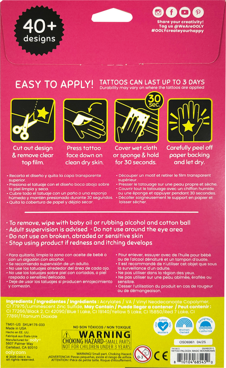 Make playtime magical with the Tattoo-Palooza Glow in the Dark Temporary Tattoos - Magic Moonbeams! This set of 3 tattoo sheets features temporary tattoos with whimsical designs like unicorns, stars, and crescent moons that glow in the dark.